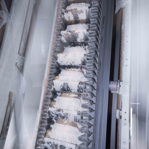 Dadurch können auch vertikale Förderstrecken realisiert werden. Gleichzeitig bleibt das Material stabil auf dem Band, ohne zurückzurutschen.